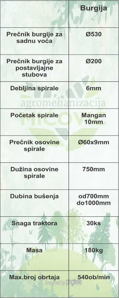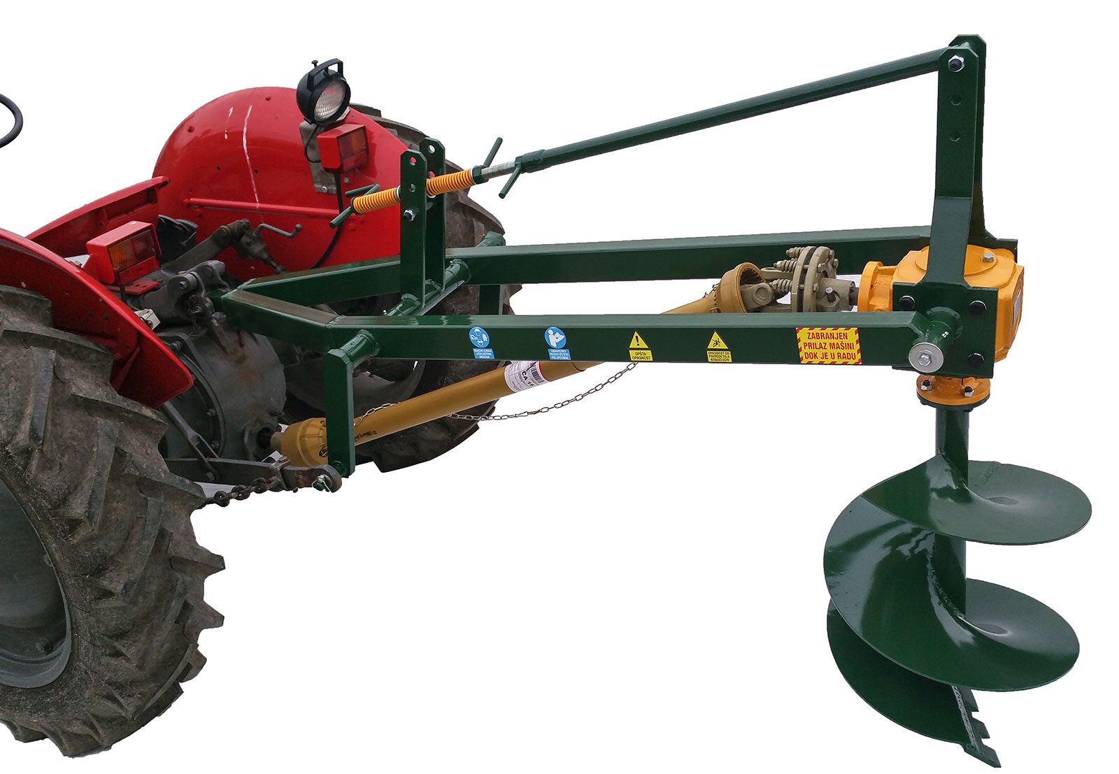Traktorska bušilica za zemlju obavlja bušenje rupa u zemlji za različite potrebe kao što su sadnja sadnica i postavljanje stubova za ograde ili žičanih špalira za voćnake i vinograde ali i za bušenje rupa za postavljanje bandera.